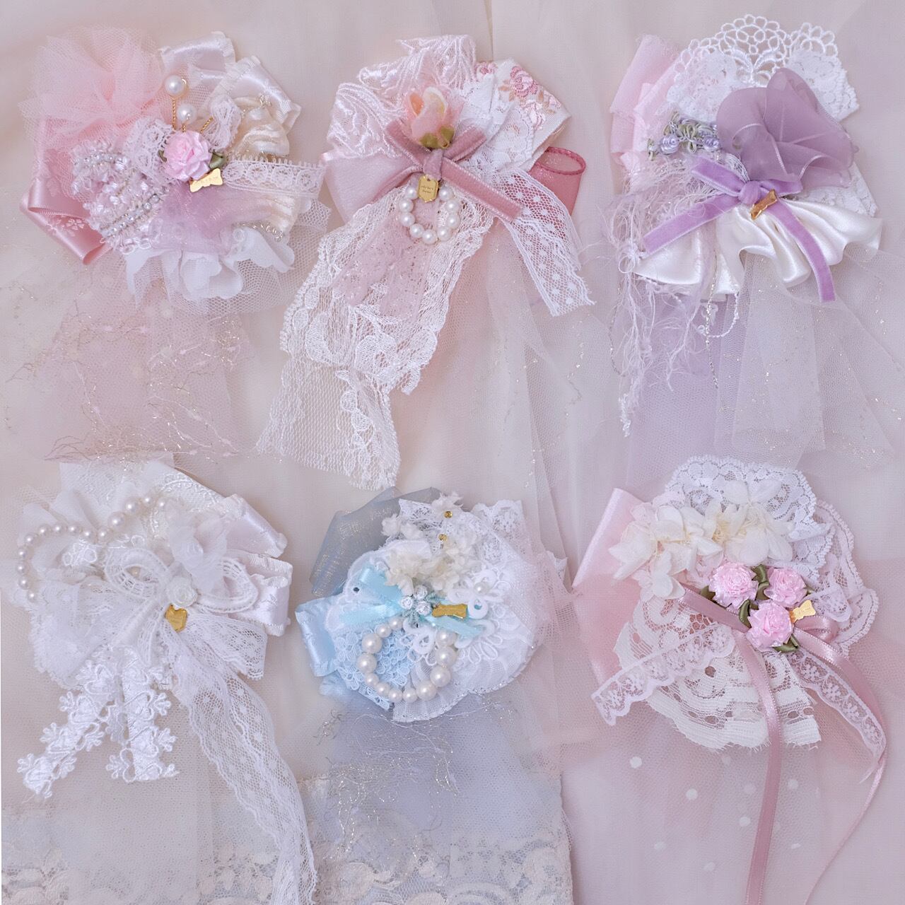 クラシカルなデザインで、どこか懐かしさも感じられような色合いと素材感を意識しました。シルクのレースをふんだんに使用しておりますので、1つでとっても存在感がありますよ♡