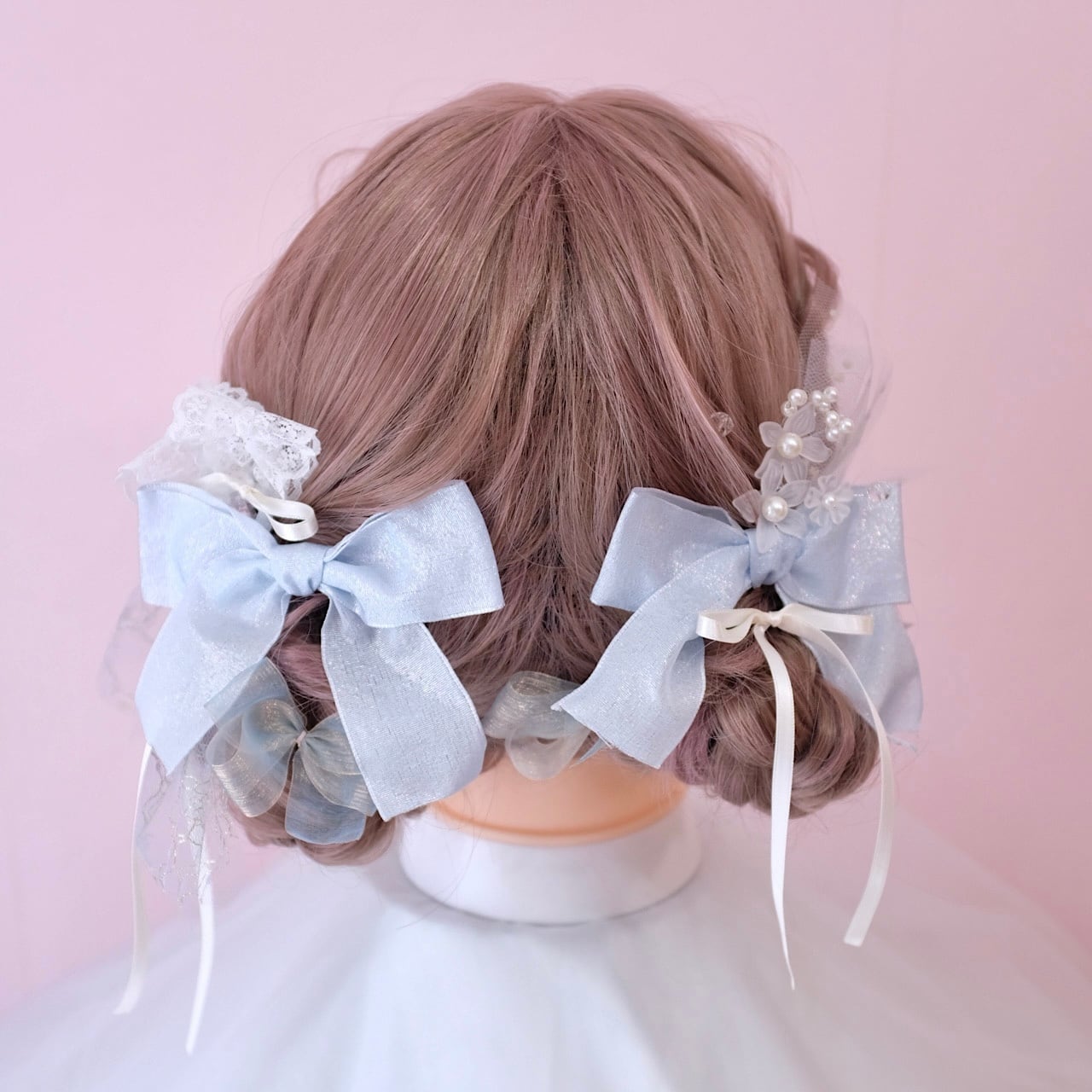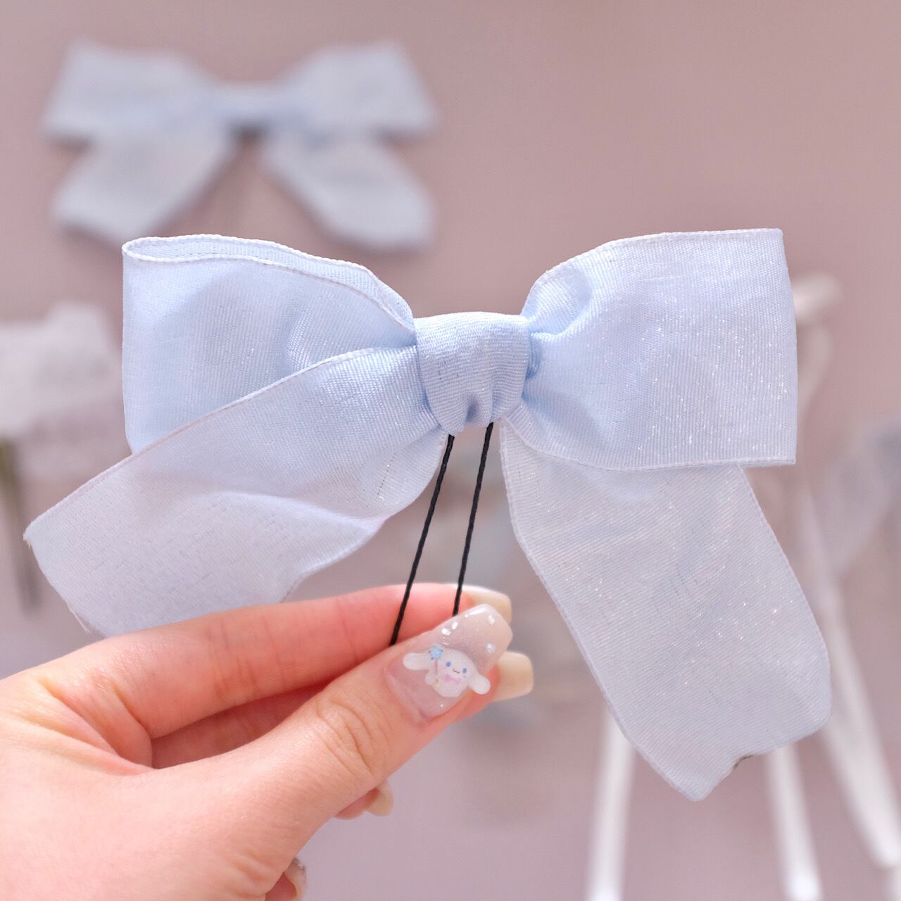 メインとなるリボンはブルーのラメ感が可愛いリボンを使用しております。縁に針金が入っているタイプなので、お好きな形に形成できます。