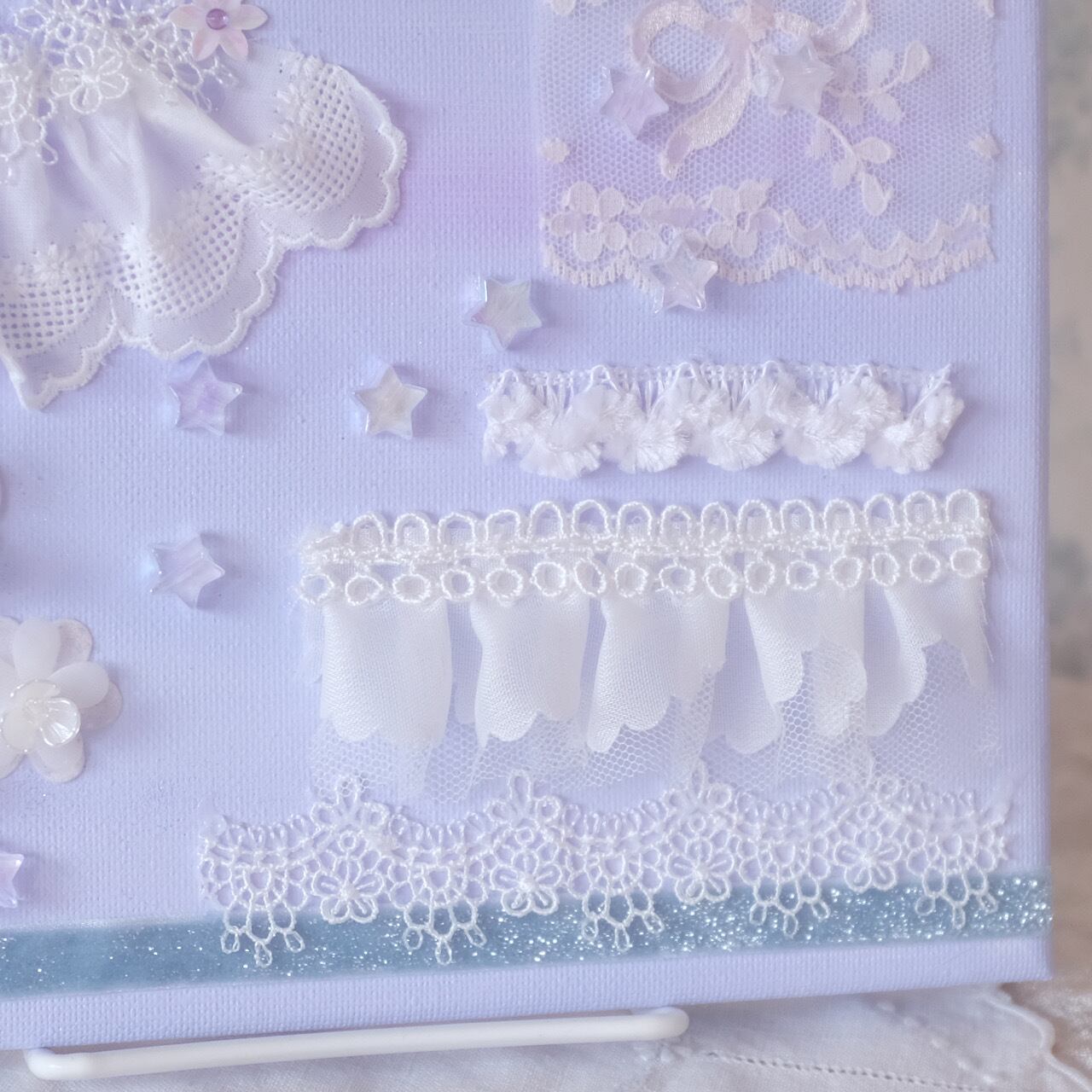 真っ白のレースやリボンで雲を、お星様はあえておもちゃビーズを使って制作しました。