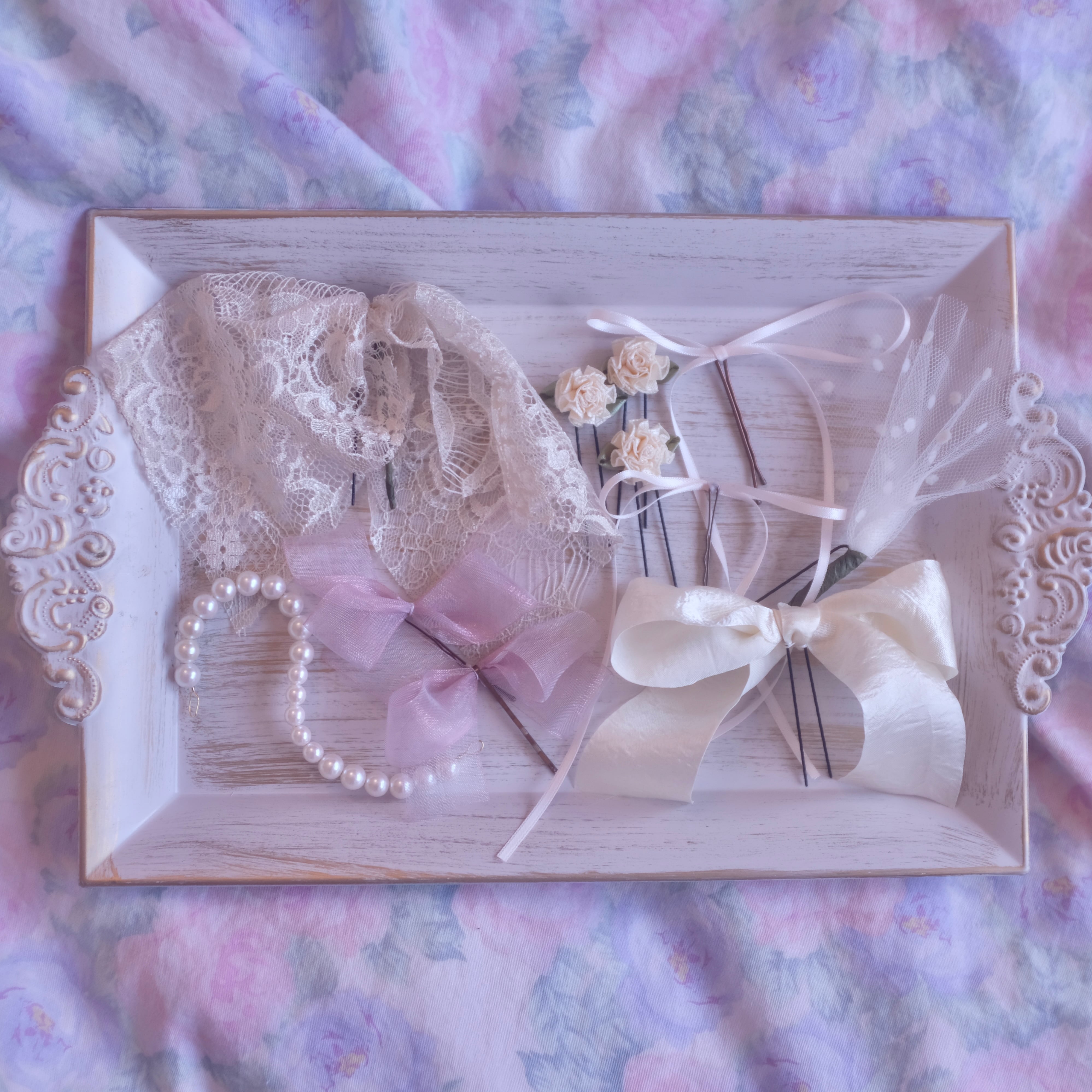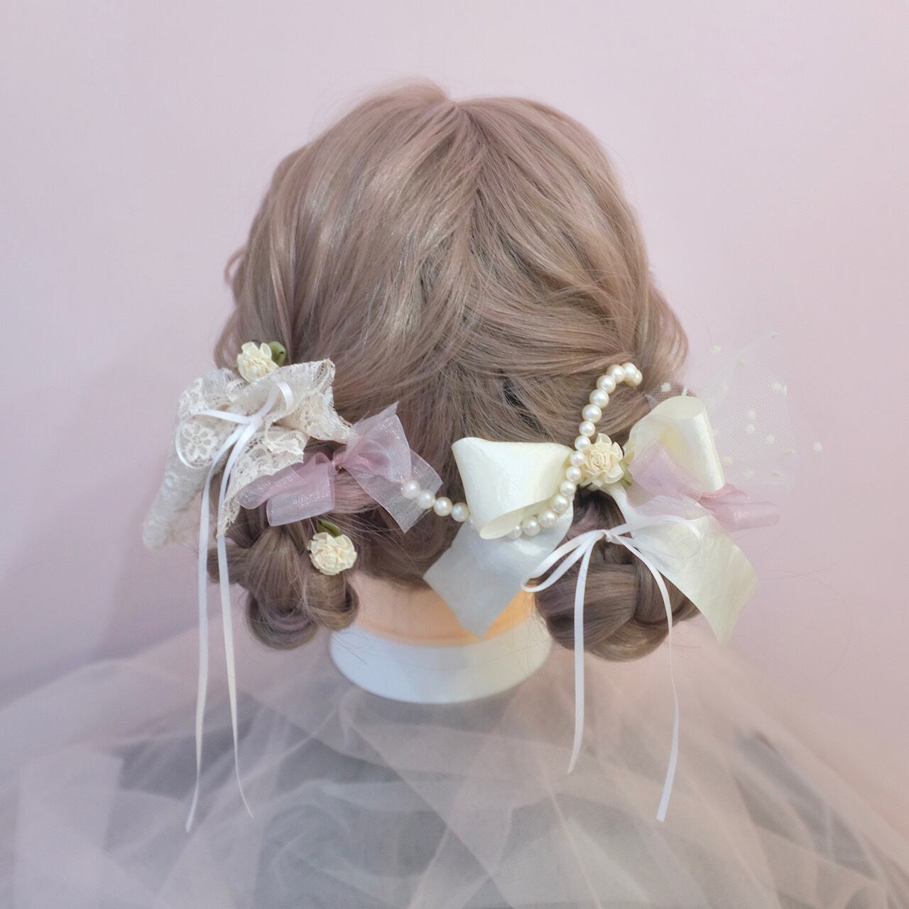 パール・レース・細めのサテンリボン・バラモチーフ・チュール・大きな白のリボンのかわいいがたくさん詰めこまれた髪飾りです♡