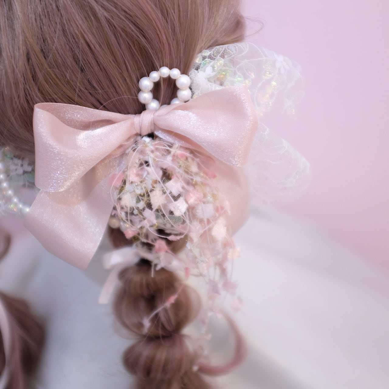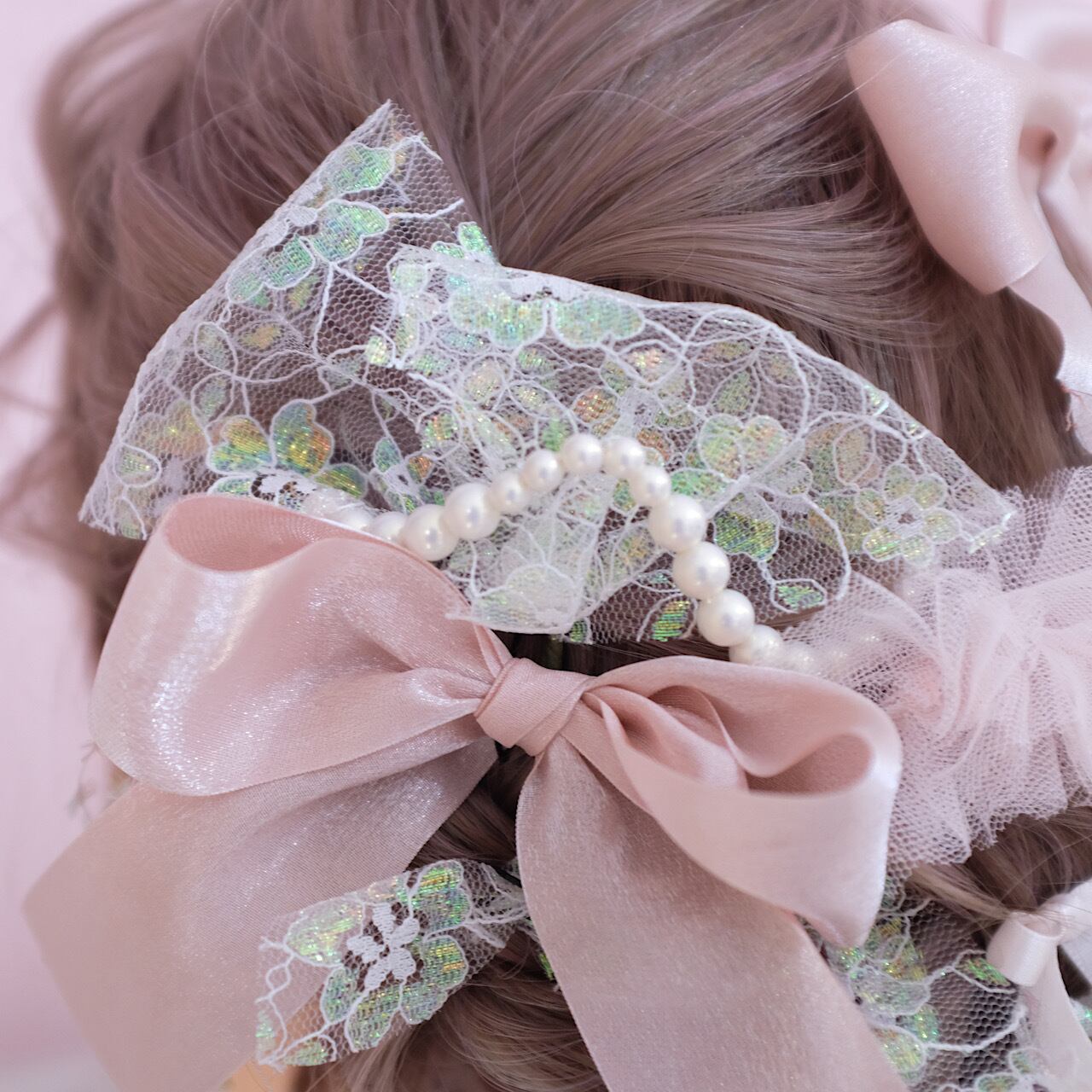 メインとなるリボンはピンクのラメ感が可愛い、リボンを使用しております。質感が柔らかく、髪に馴染む素材感です。